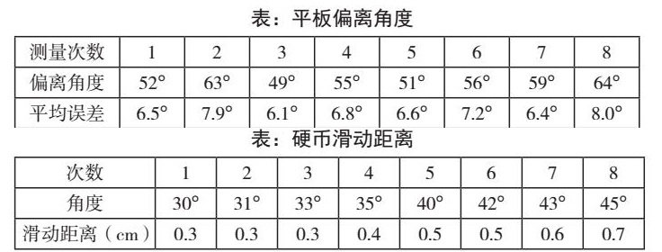 同上述步骤,继续测量1枚硬币滑离中心位置的距离,测试方法为将摆杆推至一个角度(30°-45°),在水平的平板上放置1枚硬币,并在白纸上标记其轮廓,启动系统后,观测硬币滑动的距离结果见下表: