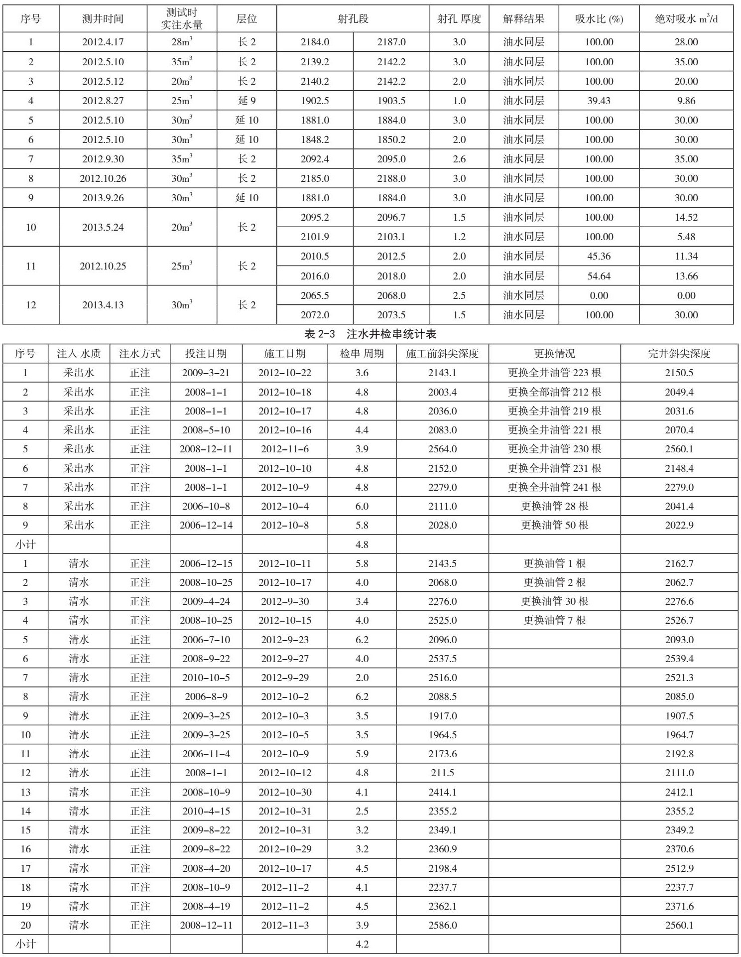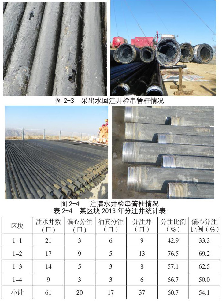 2012年底对29口正注井进行了检串作业,发现9口回注采出水管柱结垢、腐蚀情况严重,部分井斜尖部位甚至腐蚀落井等,因投注后检串周期平均4.8年,间隔时间过长导致大部分全井更换;20口注清水井检串周期平均4.2年,整体起出管柱合格,无明显结垢或破损现象。因此对于单层注水井,应该制定并严格执行合理洗井制度和检串制度。根据2012年检串情况同时考虑降低作业成本,认为回注采出水井采取半年洗井1次,2年检串1次;注清水井采取1年洗井1次,4年检串1次,同时在施工结束后从油套环空投加阻垢剂和缓蚀剂等办法,确保注水井筒及套管完好。