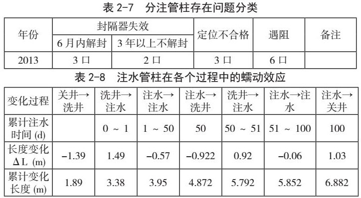 根据2013年测试、检串等作业过程中发现,分注井存在的主要问题是封隔器失效(座封后短时间就解封、座封后长期不解封)和测试遇阻。