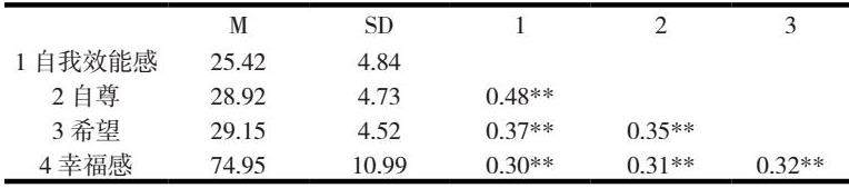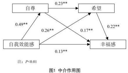 研究得出如下结论:(1)自我效能感、自尊、希望和幸福感相互正相关;(2)自尊和希望在自我效能感和幸福感之间起链式中介作用。