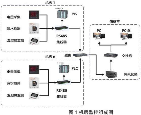 全部采用PLC 模块和监控站PC完成对所有机房采集器采集信号监控,及信号处理过程。本系统采用基于以太网的下位机监测信号采集处理系统。机房内采集设备的各项参数,一路传送至PLC模块,一路传送至监控站PC。