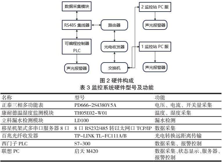 数据采集模块包括电量采集模块正泰PD666-2S3经济型LCD仪表,康耐得温湿度传感器TH05E02-W01,立科LD100机房漏水监测模块,三种模块物理层全部支持RS485通信。采集模块采集信息通过交换机送至PLC和监控站PC。机房数据采用TP-LINK TL-FC111A/B百兆光纤收发器和光纤送至值班室监控站PC 。机房内部局域网通过TP-LINK TL-SF1016D百兆16口即插即用免配置网络交换机实现连接,增加了系统的可扩展性和冗余性。数据采集设备很适用于网络连接,局域网中的计算机可以直接通过该设备上的以太网接口访问所采集到的数据,而无需在网络与设备中间另外加上其它的转换器。可编程控制器采用西门子公司的 SIMATIC 7—300 系列可编程序控制器,用于常规报警,延伸报警和重要控制对象的控制,其高速( 响应速度为 ms 级) 、精确、稳定的性能使系统可靠性进一步加强。S7—300 的报警信息,可利用西门子的 STEP7软件通过 DP 电缆直接读写 S7—300 的内部寄存器。 上位机既可以显示 PLC 的报警信息,又可以控制 PLC 的输出。硬件详情见图3。