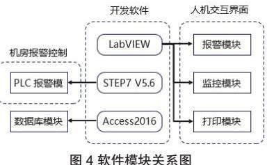 本系统的软件设计采用了模块化的程序设计思想。通过功能模块的划分,设计各个模块之间数据流向,以保持良好的可读性、可移植性和可扩充性。软件模块根据功能的不同可以划分为监控组态模块、数据库操作模块、PLC报警模块、PC机报警模块以及数据库查询打印操作模块。各模块的关系如图 4 所示。监控系统通过数据库访问接口从数据采集模块获取采样数据,并对采样数据进行处理、分析,处理后的数据保存在系统数据库中。当发现有报警信息时则调用报警模块提供声光报警,同时通过数据库通讯接口将报警信息记录到报警数据库中,供查询、分析使用。 处理的数据还可以通过数据通讯接口供局域网中的其他用户使用。
