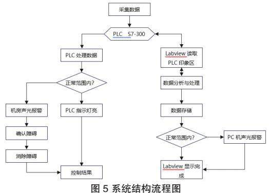 系统设计采用机房现场报警和监控站延伸报警互为补充。通过传感器将信号实时地 读入 PLC 的数据映像区。用 PPI 电缆将 PLC 和 PC ( RS 485 标准串口) 相连,上位机 PC 监控软件采用 LabVIEW 程序进行编写,通过 LabVIEW 与 PLC 的 接口将所有开关量和模拟量数据从 PLC 中取出,实现数据的显示、报警、存储、实时曲线和历史曲线分 析,故障诊断等功能。该系统还可通过上位机程序向PLC发出指令,以实现对设备的远程控制,系统结构流程如图 5 所示。
