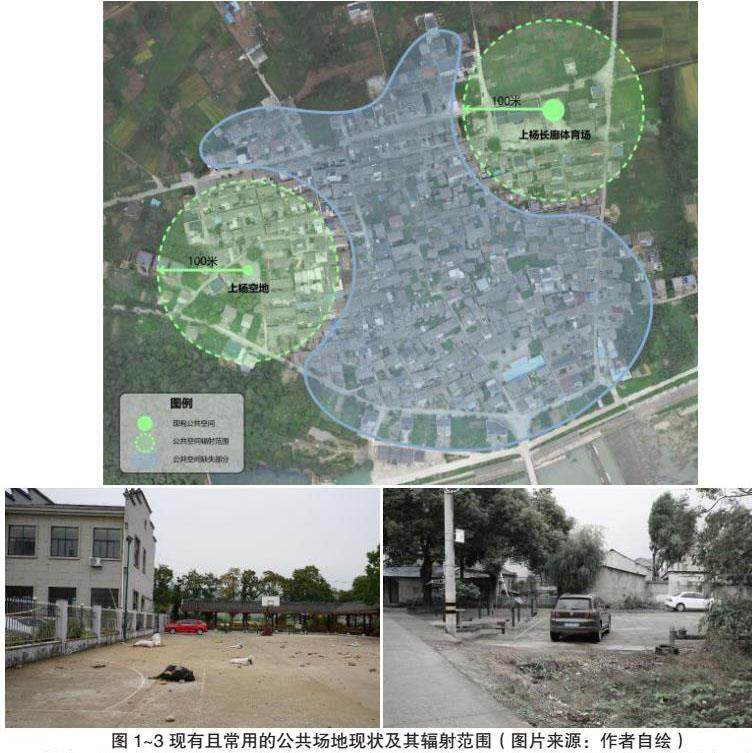 经过实地走访,笔者发现村内日间基本都是老人抚养婴儿期及学龄前儿童,只有晚上和周六日会有去镇上或者市里工作的中年人和学龄期儿童在上杨长廊附近活动,因此村内留守人群是日常使用村庄空间的最大人群。同时,现有的公共空间有上杨长廊体育场和上杨空地,使用人数较少,尤其上杨空地,因其靠近村落边缘,基本处于闲置状态。据观察,上杨长廊体育场使用人群有高龄老人,也有低龄儿童,但使用频次极低,上杨空地偶见青年男性使用。两个空间点位分别在村子村子西南角和村子东侧边缘,辐射范围远远小于村庄整体范围(图1~3)。高龄老人与儿童更通常在家中或家门口休闲。