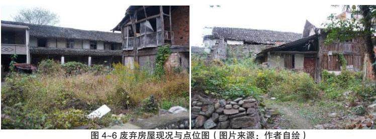 同时,村中心存在大量废弃的损坏住宅和长满野草的空地,大部分住宅与空地荒废已久、无人使用(图4~6),小部分住宅和空地常见饭后时间村民聚集其中休闲,或堆放杂物、垃圾、养鸡养鸭。据了解,村内废弃空地属于村子公共财产,因此也应算作公共空间的一部分。