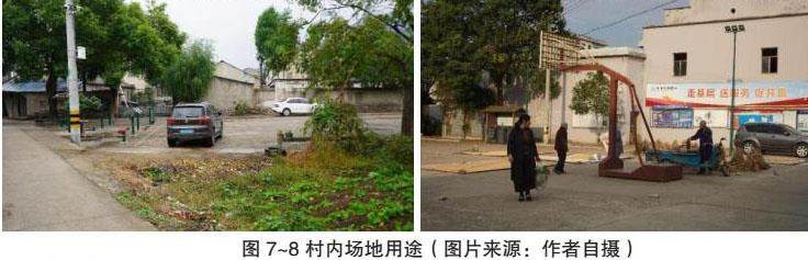 柘湖杨村内的公共场地常被村民用来进行农业作业或私人用途,随处可见晾晒的谷稻和私家车泊车(图7~8),这类区域分布在场地的各个地方,占据了原本设计的篮球场,使得动区与静区交叉,功能分区混乱。由于篮球场外包围着半圈廊道,篮球场区域(晒谷静区)并没有额外设置座椅,这就导致了老年人坐在廊道中聊天、做手工活时,儿童在旁无事可做,或儿童在篮球场空地玩耍时,老人在旁自备座椅看护儿童。二者活动配套并未兼容,缺乏基本的交流与互动。