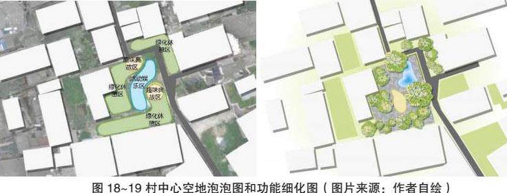 重新规划道路后将场地划分为绿化休憩区、活动娱乐区和趣味典故区三个主要分区。绿化休憩区为留守老人提供静区娱乐,可适当添置棋牌桌、健身器材,让老人动脑动手,舒缓心情,添置座椅可以在儿童进行活动娱乐时让老人休息照顾两不误。活动娱乐区主要为留守儿童设置,娱乐器材主要是以沙地、橡胶爬高设施为主,造价较为便宜,材质较为柔软,不易发生磕碰受伤,也满足了孩子爱动的天性。趣味典故区将柘湖杨村的典故如十里红妆、半幅銮架等,以设计展板的形式安插在绿化休憩区中,既能有遮荫,又让儿童在娱乐中了解村子的典故,也能让老人和儿童更好的交流。另外,重新规划道路将空地结合成一片,较之前道路从中间穿过将空地一分为三更为合适,设置绿植为活动场地和周围住户减少村路噪音、灰尘和热气干扰,也在视线的通透性、安全性上更加合理。(图18~19)