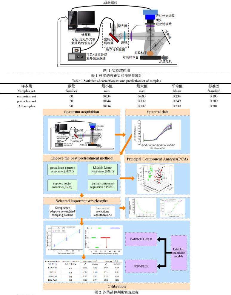 本研究基于可见近红外光谱技术提取不同品种芥菜种子光谱特征,利用三种预处理方法对光谱数据进行处理后建模,且通过CARS与SPA算法提取的特征波长,建立PLSR、MLR、SVM等数据模型。利用校正集和预测集寻求相关数值,然后对芥菜品种进行比较判断分类。具体实验方法思路如图2所示。