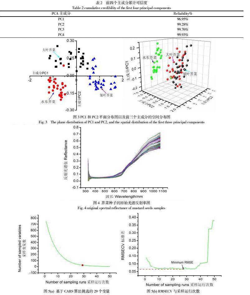 (3)以上结果表明,利用可见近红外光谱鉴别芥菜种子品种可行的,本研究为芥菜品种的快速无损检测分类鉴别提供了切实可行的方法。其研究结果也为基于可见近红外光谱快速无损检测芥菜品种的设备研发提供了理论基础。