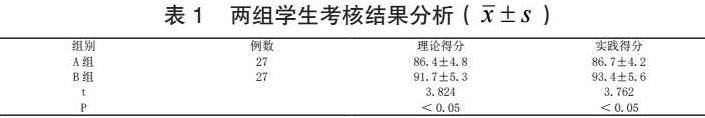 通过两组学生在院期间的学习和考核成绩来看,虽然两组学生理论和实践平均得分均在80分以上,但是组间数据对比提示B组理论和实践平均得分均高于A组,差异显著(P<0.05)。