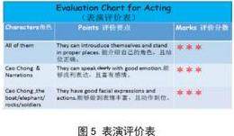 活动1:小组合作读演曹冲称象的片段。英语课堂具有交互性和社会性的特点,利用短剧表演的方式,引领学生多角度去赏析语篇,这个过程让学生真实的情境中运用语言,并在实践中解决问题。学生分角色扮演曹冲、士兵、大象等,师生课前准备好道具,如秤、大象、船、岩石等,旁白也起到很大的作用,她们在语言框架的辅助下演好中国故事。学生一边表演,一边欣赏曹冲细致的动作,缜密的思维,有助于学生塑造内在人格和外在行为。