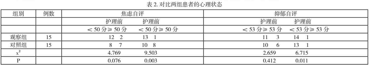 摘要:目的:探讨基于PDCA循环的心理护理管理在宫颈癌化疗患者中的应用效果,特别是对患者心理痛苦、焦虑和抑郁症状的影响。方法:本研究纳入了2023年3月至2023年11月期间在某医院接受化疗的30例宫颈癌患者。采用随机分组方法,将患者分为对照组和观察组,每组各15例。对照组接受常规护理,而观察组在常规护理基础上实施基于PDCA循环的心理护理管理。评估工具包括焦虑自评量表(SAS)和抑郁自评量表(SDS)。结果:护理干预前,两组在焦虑和抑郁的发生率上差异并不显著(P>0.05)。护理干预后,观察组的焦虑和抑郁的发生率较对照组有显著下降(P<0.05)。结论:PDCA循环心理护理管理能有效改善宫颈癌化疗患者的心理健康状态,减少焦虑和抑郁的发生,从而提高患者的整体治疗效果。