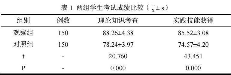 在考试成绩方面,可以发现两组学生在理论知识考查和时间技能获得上具有极大的差别,尤其在实践技能获得方面,观察组成绩显著高于对照组。经过数据对比,可以得出P<0.05。因此,此差异存在统计学价值。具体数据对比内容见表1。