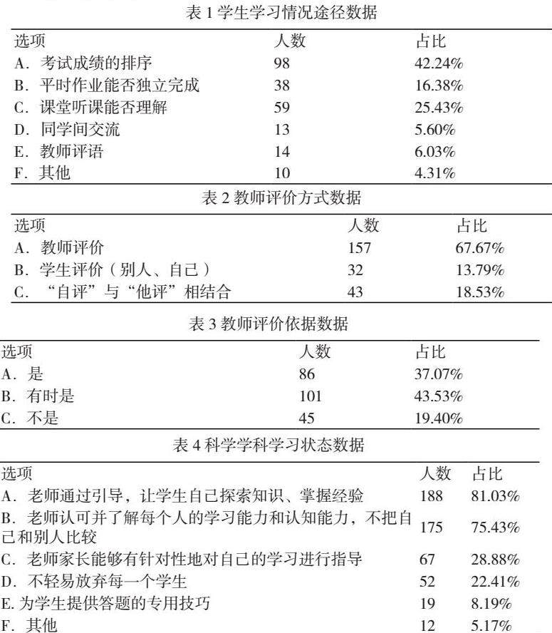 本次研究的调查对象为福建省泉州市丰泽区小学一到六年级学生,总计调查250名学生,回收有效问卷232份,有效回收率92.8%。调查内容为十五道题目,其中两道基础信息问题、十三道核心问题,核心问题中包括十一道单选题和两道多选题,涉及学生自身评价、教师评价、评价标准、学习状态等多个维度,能够反应小学科学学业评价现状以及存在的问题。