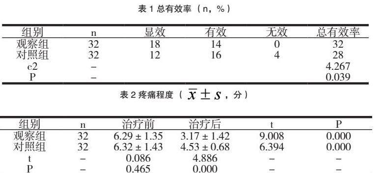 观察组治疗前后由约6.29分降低到约3.17分,对照组治疗前后由约6.32分降低到约4.53分,P<0.05。见表2: