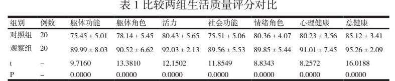 如表1所示:观察组采用臭氧自体血回输进行治疗后,病人的生活质量显著改善,和对照组相比结果有差异性(P<0.05)。