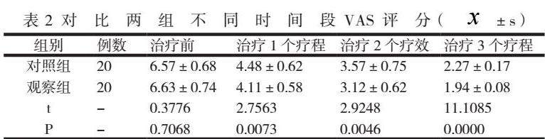 如表2所示:开展治疗前后对病人的疼痛情况进行评估,实施治疗前(P>0.05);治疗几个疗程后,病人的疼痛情况有减轻,观察组的疼痛情况改善更好,结果比较(P<0.05)。