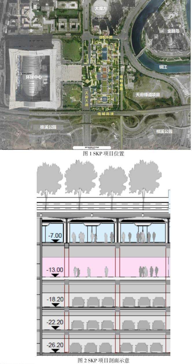 本工程为成都SKP项目,位于四川省成都市交子公园商圈核心区,为全国首个下沉式高端时尚百货,同时也是亚洲最大的下沉式建筑,北邻锦悦东路,西近天府大道,南近绕城高速,如图1所示。该项目为地下五层建筑,其±0.00m层为公园,地下一、二层功能为商业,分为东馆、北馆、南馆、及商业村,地下三~五层为汽车库,如图2所示。项目总建筑面积约34.4万m2,其中地上建筑面积约2.1万m2;地下建筑面积约32.3万m2,地下商业面积约14万m2、地下车库面积约15.8万m2、地下设备用房面积约2.5万m2。鉴于项目实际,工程设计了室内、外消火栓系统,自动喷水灭火系统,泡沫-水喷淋系统,给水系统,排水系统,雨水系统。同时针对设计难点进行科学分析,并给出了解决对策,最终顺利完成本建筑的给排水系统设计,呈现出良好的运行使用效果。