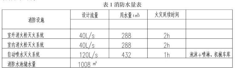 地下三层设置两座能独立使用的消防水池,总有效容积1045m³,其内储存火灾延续时间内的室外消火栓,室内消火栓及自动喷水灭火系统的用水量,消防用水量见表1。