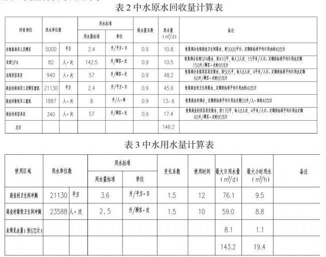 因地块周边无市政中水管网,本项目中水系统机房设置于商业村区域地下负四层,包括中水处理机房和回用机房。经水量平衡计算(详见表2,表3),本次原水取自商业村及北馆1~2F商业卫生间和美容美发等盥洗排放的优质杂排水,原水量约为146.2m³/d。自建中水处理机房采用MBR水处理工艺,处理水量为7m³/h,设计运行时间20h/d,满足回用水量要求。中水水质达到《城市污水再生利用城市杂用水水质标准》中要求的冲厕水质标准后,储存于中水水箱,通过变频给水机组提升至商业村供冲厕用水。