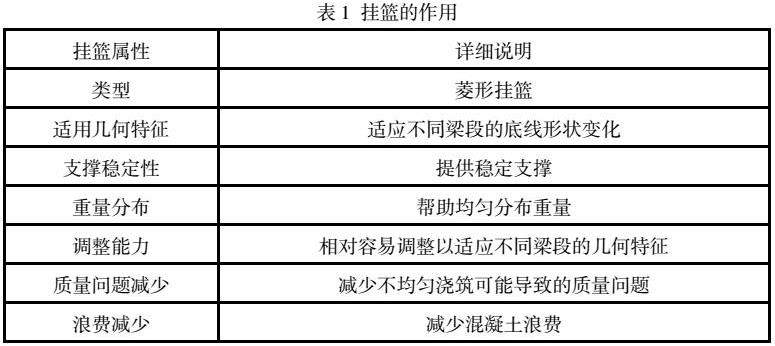 挂篮是用于支撑混凝土浇筑的重要设备,挂篮的选择需要考虑梁段的几何特征、重量和其他工程参数。在这个工程中,采用了横向错位2个节段施工,这样可以组织流水施工,避免作业人员窝工,减少项目成本支出,提高作业效率。选用菱形挂篮的优点在于它们提供了稳定的支撑,并且相对容易调整以适应不同梁段的几何特征。横向错位和纵向对称的施工可以帮助均匀分布重量,减少不均匀浇筑可能导致的质量问题。例如,如果梁段的底线形状变化明显,挂篮可以相应调整,以确保挂篮底部与梁底线形状一致。这有助于减少浇筑不均匀和混凝土的浪费。挂篮详细作用如表1所示。
