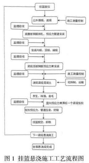 施工工序是确保T构桥梁挂篮悬臂浇筑按照计划进行的关键因素。首先,需要准备工作,包括挂篮的安装和调整,混凝土的搅拌和运输,以及浇筑前的质量检查。然后,浇筑过程需要按照节段划分逐一进行,确保每个梁段的混凝土浇筑都满足质量要求。每个梁段的浇筑需要精确控制混凝土的流动和浇筑速度,以确保混凝土填充梁段的每个部分,而不会出现空洞或冷缝[3]。挂篮具体施工工序如图1所示。