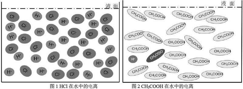 设计意图:通过教师展示提供的两幅粒子动图,学生通过讨论分析,有能力根据已学知识分析并得出在水中盐酸完全电离,醋酸不完全电离的结论。教师从而顺着学生的结论给出强弱电解质的概念和符号表征方式,一切水到渠成。