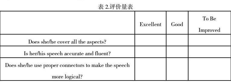 在学生完成该活动后,教师基于所设计的评价量表(见表2),首先对1-2个学生的表现进行评价,评价标准基于表达中信息的完整度、准确度和流利度以及逻辑性等方面,评价等级包括优秀、良好及待提升等三个等级,让其他小组成员在相应的评价栏里打钩,并开展口头评价,充分体现学生作为评价主体的地位。