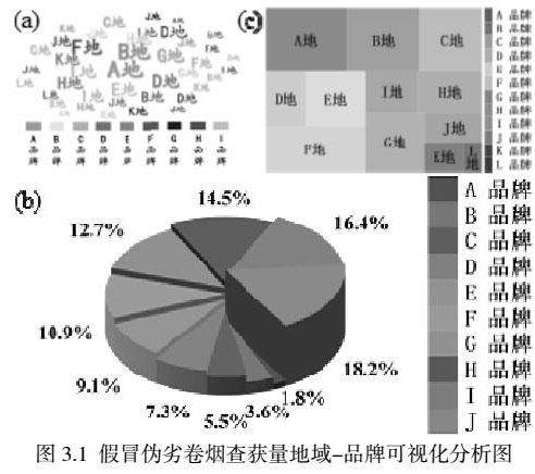 针对假冒伪劣卷烟“地域-品牌”维度信息的可视化视图如图3.1所示,通过词云图+3D饼状图+Treemap图联用展示了某地假冒伪劣卷烟查获数量分布情况及品牌占比等信息:图3.1(a)利用词云图的直观性,一方面通过字体的大小区分了不同地域假冒伪劣卷烟查获量,另一方面以不同颜色代表各种假冒伪劣卷烟的品牌,通过词云图中地名的相对位置可以看出:字体愈大、显示位置愈靠近中央位置,则该地区在总区域内假冒伪劣卷烟查获量占比愈大,从而通过字体的放大与相对位置展示需重点关注的地域与品牌信息。该图在展示假冒伪劣卷烟高发地域的同时,着重反映了当地查获的主要品牌;图3.1(b)重点放大了词云图中某一区域的假冒伪劣卷烟查获情况,以3D饼状图直观展示各品牌查获占比的同时,通过颜色的不同汇总了当地常见假冒伪劣卷烟品牌信息;图3.1(c)构建目的是以Treemap图展示各地域假冒伪劣卷烟查获层次关系,通过矩形面积大小展示了各地域查获假冒伪劣卷烟的数量关系,而颜色的不同展现了当地假冒伪劣卷烟查获品牌种类的复杂性。