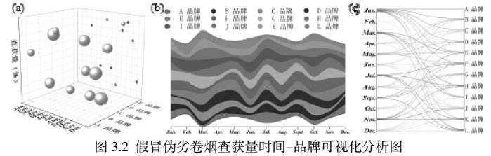 假冒伪劣卷烟“时间-品牌”维度可视化属于典型的时序性构图,通过分析随时间序列变化的品牌信息,预测研究对象在下一周期中可能出现的规律。如图3.2(a)所示,通过泡点图将时间序列与假冒伪劣卷烟查获数量最多的品牌信息建立了关联,随着时间的推移,区域内常见假冒伪劣卷烟的品牌信息一览无余,对应品牌假冒伪劣卷烟当月查获数量占总体比例情况由球体大小直观体现,同时各月份假冒伪劣卷烟查获总量于Z轴同步展示;图3.2(b)所示的主题河流图形象的展示了不同研究对象的变化形式,图片中每一个颜色的“河流”代表了不同假冒伪劣卷烟品牌在指定时间跨度内的数量波动情况,“河流”波动越湍急即代表着相应品牌在该时间段的数量变化越剧烈;图3.2(c)所用的平行坐标图简单明了的帮助用户实现了视觉聚类,以相对柔和的曲线直观展示了特定月份集中出现的假冒伪劣卷烟品牌可视化,从而对不同月份假冒伪劣卷烟稽查达成示警作用。