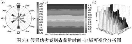 “时间-地域”可视化分析需同时满足时序性与空间分布的要求,所以多维可视化分析采用相对均衡且信息统计比较全面的方式进行描述。如图3.3(a)所示,采用风向玫瑰图对全年12个月份进行统计描述,以单一品牌假冒伪劣卷烟作为研究对象,探究该品牌在不同月份中各地出现规律。将不同颜色代表各地域,半径代表出现范围,最终在某一方向代表的月份中,颜色越丰富即指定品牌假冒伪劣卷烟出现的地域越多,则该品牌在某时间范围内出现了扩散;如图3.3(b)所示,堆积面积图通过一张图显示全年各地区各月份假冒伪劣卷烟查获总量变化情况,以时间为自变量,实现各地假冒伪劣卷烟查获总量平行显示,图形的堆叠有助于直观对比不同时间各地域假冒伪劣卷烟查获情况;如图3.3(c)所示,3D柱形图通过坐标系的精准指向可以在一张图表中实现假冒伪劣卷烟各地域,各时间段的综合演示,3D柱形图不仅可以高效、精准发现任意地区在某一时间点的假冒伪劣卷烟查获情况,亦可多角度协助专卖稽查纵览各地在指定周期内的查获量波动情况。