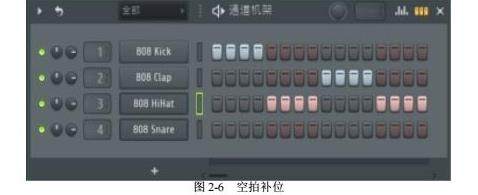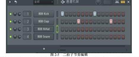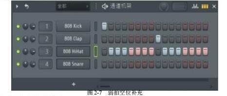 在学生完成第二步结束之后可能会出现以上两种情况,在第三个音上的选择会有不同,但是实则是不影响的,因为第三个音作为“次强”两种音色都比2、4拍上的音在听觉上感受是要强一些,但又没有第一拍的力量重,所以两种选择都是合理的。此时在结构上已经构成了最基础的节奏型编写。为了加强练习,要求学生结合“强弱规律”在FL Studio中创作简单的四二拍的节奏律动。