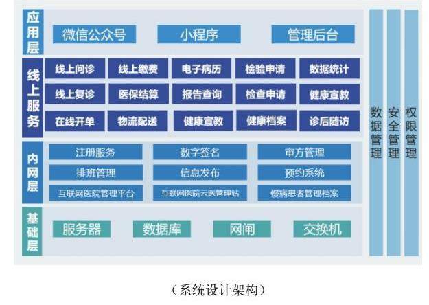 阿拉善盟中心医院互联网医院平台整体由基础层、内网层、业务服务层、监管层以及前端展示构成,核心业务包括线上问诊、线上复诊、线上处方、医保缴费。设计思路一是通过互联网医院平台整体框架下进行二次开发和扩展,满足慢病患者就诊、取药相关需求;二是扩展健康档案,形成慢病患者电子健康档案;三是丰富数据统计量表,针对慢病种类、人群、分布等多维度进行统计分析,对医院后续慢病防治工作提供有效的数据支持;四是整合和细化健康宣教服务,实现慢病患者根据病种、病情精确接收指导与资讯;五是支持多种前端展示方式,目前患者前端可通过微信公众号、支付宝小程序等中部署应用。