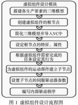 要想在智慧车间生产活动中合理应用数字孪生关键技术,首要前提是建立数字孪生运行体系,具体可以从虚拟组件设计、数字化工艺设计两个方面着手。第一,虚拟组件设计。在智慧车间中有应用数字孪生关键技术,需要在虚拟组件设计过程中编制三维模型、设置组件属性、编写内部驱动程序。通常情况下,虚拟组件的基本组成单元为组件节点、行为、属性、特点。具体设计流程如图1所示。