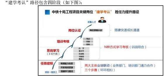 中铁十局聚焦员工专业胜任力提升,把集中学习、岗位练习、阶段测试、岗位带教等学习方式整合成一条学习路径,设计成“建学考认”路径图,组织员工有序地学习。学习活动中既包括传统的面授,又包括自学、岗位练、导师带等方式,既弥补了传统面授培训的不足,又与传统培训模式相比,也缩短了员工达到岗位胜任标准的时间。