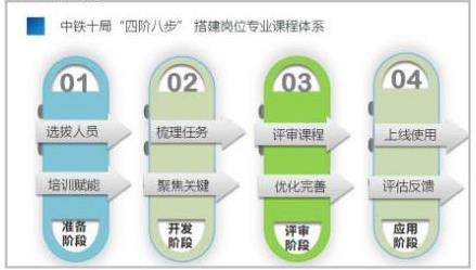 (1)开发学习内容资源。培训部门指导业务部门利用五星教学、经验萃取等方法,建成了“横向分模块、纵向分层级”的项目关键岗位专业课程体系。为保证课程内容贴合工作场景,突出针对性、实用性,中铁十局自主创新“四阶八步”课程开发方法。