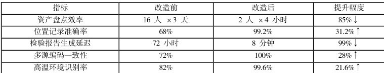 2. 研发的抗金属超材料标签与三级编码算法,在高温复杂环境下实现了 99.6% 的可靠识别与 100% 的编码一致性;