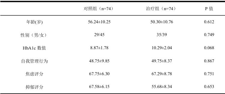 两组患者的一般情况(年龄、性别),各指标(HbA1c 数值、自我管理行为、焦虑评分、抑郁评分)等无显著差异(P>0.05),两组之间存在可比性。