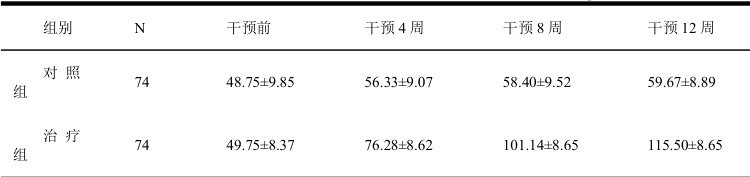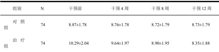 用重复测量的方差分析法比较2 组患者干预前后 2-CDSG 数值,发现两组随干预时间的延长而升高,治疗组差异具有统计学意义 (p<0.05) ),存在时间效应,组间效应,对照组差异无统计学意义 (p>0.05) );用 LSD 法