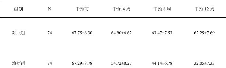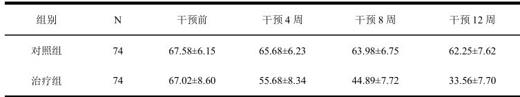 用重复测量的方差分析法比较 2 组患者干预前后SDS 数值,发现两组随干预时间的延长而降低,治疗组差异具有统计学意义 (p<0.05) ,存在时间效应,组间效应,对照组差异无统计学意义 (p>0.05) ;用LSD 法进行两两比较,患者干预后各时间段治疗组SDS 评分均低于对照组,差异具有统计学意义 (p<0.05), 。