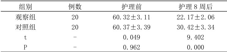 PFDI-20 评分对比:护理前两组评分均较高( (Pgtrsim0.05) );护理 8 周后观察组评分更低于对照组( (P<0.05) )。见表 1。