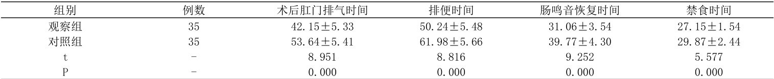 摘要:目的:探讨普外科加速康复外科(ERAS)标准化护理路径在结直肠手术患者中的实施效果,从康复效率、并发症等多维度进行评价。方 法:选取 2024 年 1 月至 2024 年 12 月在本院接受结直肠手术治疗的 70 例患者作为研究对象,采用随机数字表法将其分为对照组和观察组,每组 35 例。对照组实施常规护理,观察组实施普外科 ERAS 标准化护理路径。观察并比较两组患者术后肛 气 排便、禁食及肠鸣音恢复时间等康复指标,以及切口感染、深静脉血栓、吻合口瘘与肺部 统计软件对数据进行分析。 观察组各项指标康复用时均显著短于对照组( (P/0.05) );观察组术后并发症总发生率为 5.71% ,明显低于对照组的 22.86%(P<0.05)。结论:普外科 ERAS 标准化护理路径能有效提高结直肠手术患者的康复效率,降低术后并发症发生率,在临床护理中具有较高的应用价值,值得推广。