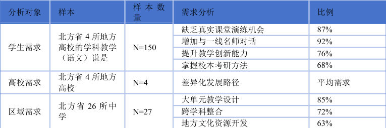 通过问卷、访谈与文本分析,整合“学生—高校—区域基础教育”三方的核心诉求。课题组对某北方省 4 所地方高校语文教育硕士的调查发现,学生普遍渴望增加真实课堂演练机会及与一线名师的对话频次,同时在职业发展上,主要希望提升教学创新能力和掌握校本教研方法。高校方面,地方综合性大学需要通过差异化培养路径来凸显办学特色,如某大学利用“宋韵文化”研究优势,提出了培养具有文化转化力语文教师的目标。而区域需求方面,2024 年对所在省份27 所中学的调研显示,语文教师在大单元教学设计、跨学科整合、地方文化资源开发等方面存在能力短板,新教师往往缺乏单元整体视角及将本地非遗融入写作教学的能力。(见表3.1)