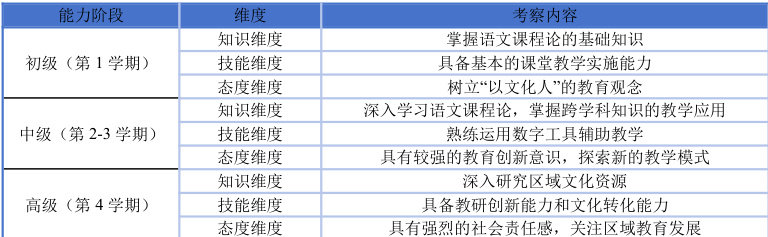 基于需求分析,构建“三维四阶”培养目标框架(见表3.2),从四个阶段动态考察知识维度、技能维度、态度维度在四个能力阶段的发展提高。知识维度考察掌握语文课程论、学习心理学、教育技术学等跨学科知识;技能维度考察形成教学设计、课堂实施、教研创新、文化转化这四项核心能力;态度维度重视“以文化人”的教育信念与终身发展意识的形成。
