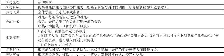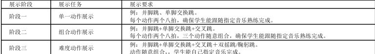 在进行了一定阶段的基础动作及难度动作教学与练习之后,课堂上可增加组合比拼展示。案例如在期中和期末均安排小组比拼方案,激励学生练习兴趣,增加课堂趣味。活动方案如下:
