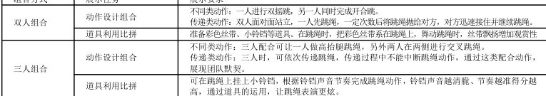 教学安排可从基础动作入手,再融入一些简单花样,像开合跳、并脚左右跳,提升观赏性。适时加入稍难动作,增加表演亮点。在对学编排的动作进行点评时,可提出注意动作的流畅性、观赏性、节奏变化等特点。