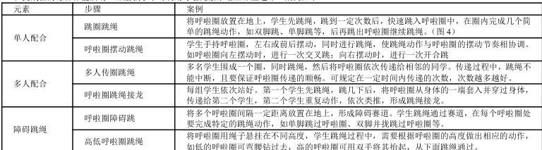 “呼啦元素”是将呼啦圈运动与花样跳绳结合创编出的新型运动形式,通过两种器材的动作融合、节奏配合或空间组合,形成更具趣味性和挑战性的综合体能活动。课堂教学中可利用呼啦元素来增加课堂趣味。案例如下: