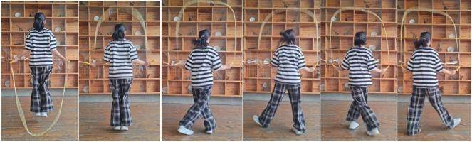小学生初学习花样跳绳是知晓动作名称、观看示范动作、分解动作练习。比如知道“双摇”需要手腕发力、起跳高度等要点。或许能照葫芦画瓢完成动作,但节奏、连贯性、身体协调性往往不足,容易因细节错误导致失败(如绳子打脚)。停留在“学”的阶段容易依赖教师指导,缺乏自主调整能力,遇到新场景(如表演、比赛)时容易失误。