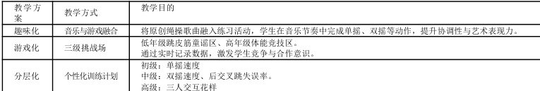 全面分析学生的身体素质、跳绳基础、学习能力、兴趣爱好等方面的差异。如通过简单的跳绳测试,了解学生的跳绳速度、协调性等基本情况;通过与学生的交流,掌握他们对花样跳绳的兴趣点。明确花样跳绳教学的总体目标,如提高学生的身体素质、培养学生的跳绳技能和跳绳兴趣等,同时将总体目标细化为具体的、可操作的小目标,如在某个教学阶段学生应掌握的特定花样跳绳动作。